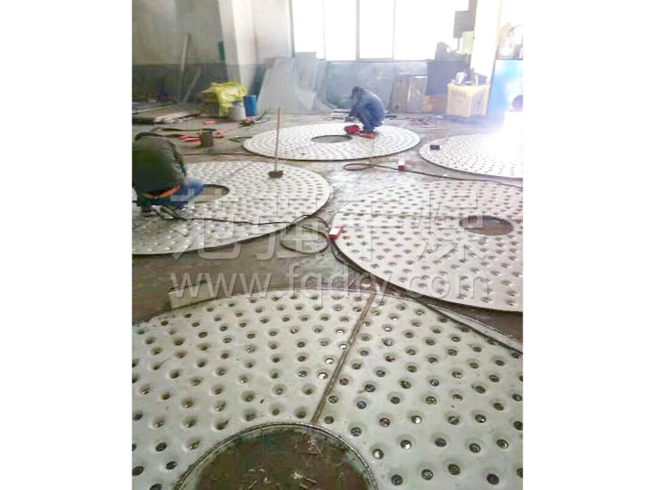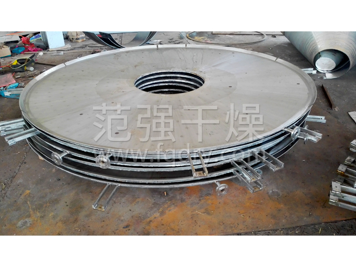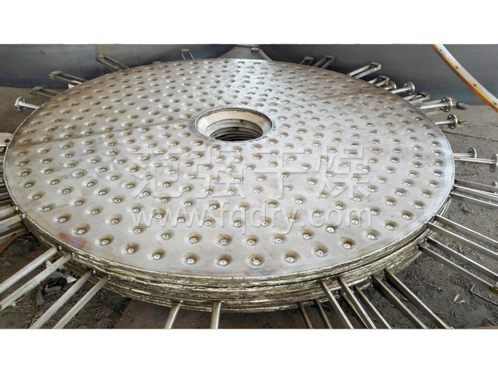 濕物料自加料器連續地加到盤(pán)式連續干燥機上部第一層干燥盤(pán)上,帶有耙葉的耙臂作回轉運動(dòng)使耙臂作回轉運動(dòng)使耙葉連續地翻抄物料。物料沿指數螺旋線(xiàn)流過(guò)干燥盤(pán)表面,在小干燥盤(pán)上的物料被移送到外緣,并在外緣落到下方的大干燥盤(pán)外緣,在大干盤(pán)上物料向里移動(dòng)并從中間落料口落如下一層小干燥盤(pán)中。大小干燥盤(pán)上下交替排列,物料得以連續地流過(guò)整個(gè)干燥器。中空的干燥盤(pán)內通入加熱介質(zhì),加熱介質(zhì)形式有飽和蒸汽、熱水和導熱油,加熱介質(zhì)由干燥盤(pán)的一端進(jìn)入,從另一端導出。已干物料從底層干燥盤(pán)落到殼體的底層,而后被耙葉移送到出料口排出。濕份從物料中逸出,由設在頂蓋上的排濕口排出,真空型盤(pán)式干燥機的濕氣由設在頂蓋上的真空泵口排出。從底層排出的干物料可直接包裝。通過(guò)配加翅片加熱器、溶劑回收冷凝器、袋式除塵器、干料返混機構、引風(fēng)機等輔機,可提高其干燥的生產(chǎn)能力,干燥膏糊狀和熱敏性物 料,可方便地回收溶劑,并能進(jìn)行熱解和反應操作。