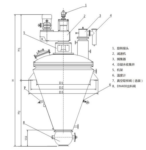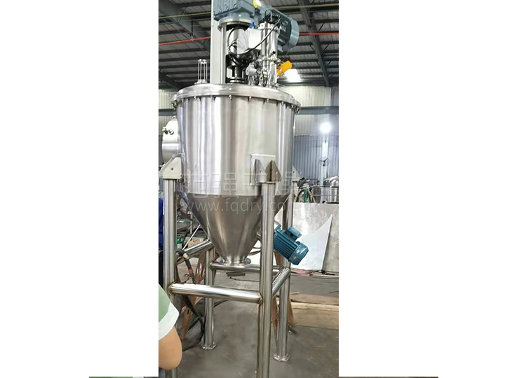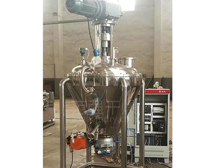 由加熱錐體設有加熱夾套,熱源為熱水、導熱油或低壓蒸汽,從而使錐體內壁保持一定的的溫度。變頻調速電機經(jīng)平行斜齒輪減速機,驅動(dòng)單螺帶攪拌器旋轉,帶動(dòng)物料沿錐型筒旋轉并自下而上提升,物料到達最高點(diǎn)后由重力和慣性作用,自動(dòng)流向旋渦中心回到錐型筒體底部,整個(gè)過(guò)程使物料在錐型筒體內強制加熱,相對對流、摻混,熱量在物料中相互擴散,使物料作全方位的不規則往復運動(dòng),完成物料同單螺帶和筒壁表面進(jìn)行高頻率傳熱交換,在短時(shí)間內達到加熱干燥的效果。從而使物料內部水份不斷蒸發(fā),在真空泵的作用下,水蒸汽由真空泵引出,如須回收液體溶劑可加冷凝器、回收液儲罐回收。干燥完成后,打開(kāi)下部的出料閥出料。