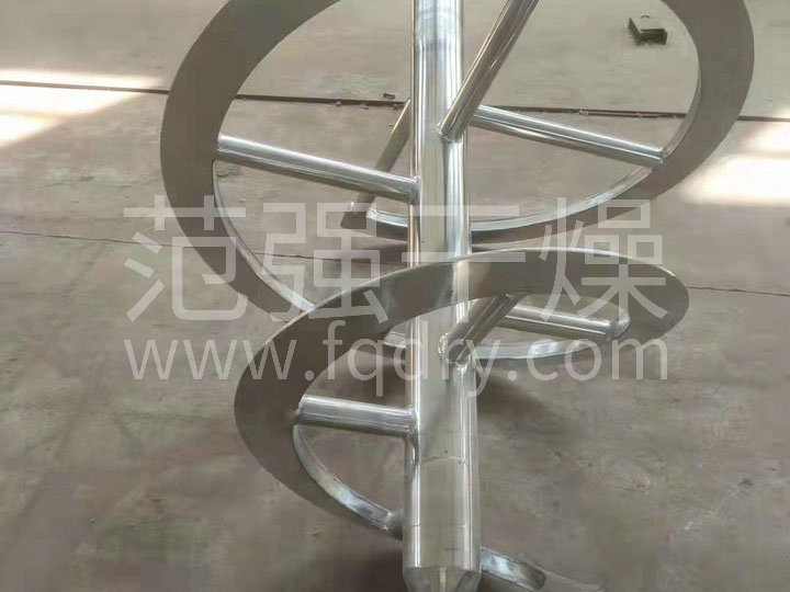 空心攪拌軸用支撐桿分別與空心螺帶連接,與空心螺帶連接的上下端用空心支撐桿形成可通過(guò)熱媒的回路。為了保證物料不粘結于筒壁,螺帶與筒壁的間隙很小。